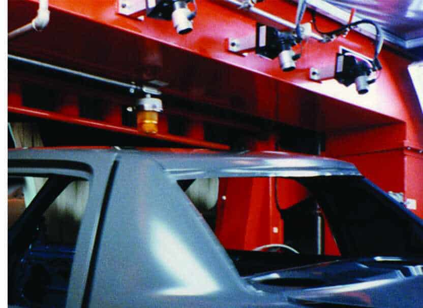 Tres (3) Cañones de Aire Ionizado Gen4 soplan los contaminantes de las carrocerías de los autos previos al proceso de pintura.