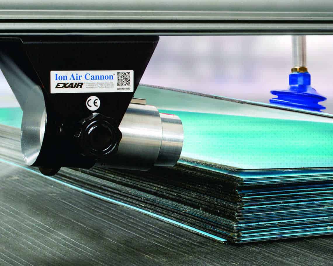 Los Cañones de Aire Ionizado Gen4 modelo 8192 proveen eliminación de estática entre los lentes de paneles solares para asistir la separación de los mismos durante la producción.
