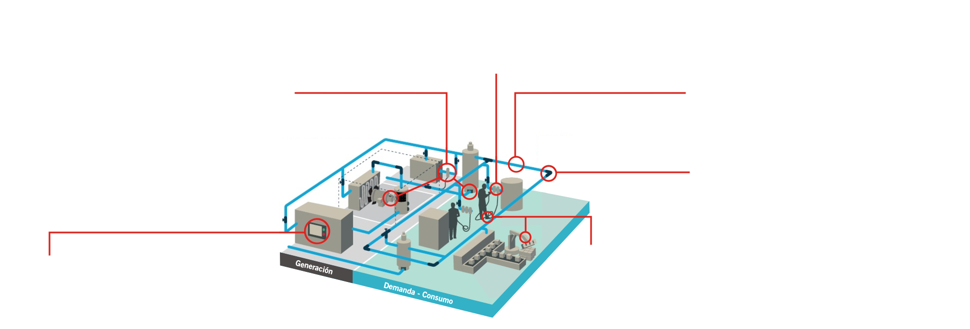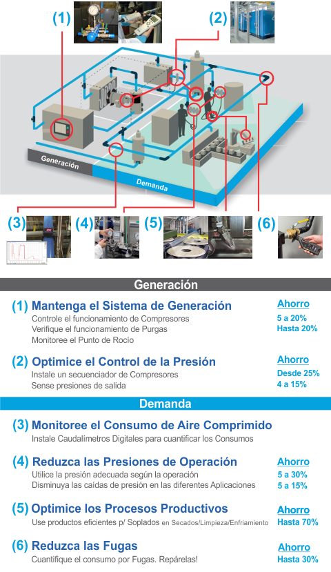 En toda Instalación de Aire Comprimido existen importantes oportunidades para Optimizar el desempeño y el consumo energético de la misma. Como ha sido comprobado, la Optimización del Sistema y sus Aplicaciones, pueden derivar en una reducción de hasta el 50% del consumo eléctrico.
