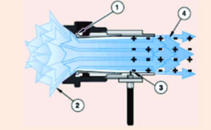 El Cañón de Aire Ionizado Gen4 incorpora un Súper Amplificador de Aire y un collar ionizador energizado por una fuente de alimentación. Una pequeña cantidad de aire comprimido es inyectada en el barril de Cañón (1) induciendo a un gran flujo de aire circuncidante a fluir a través de él (2). Un punto emisor reemplazable a la descarga final del Cañón (3) ioniza la corriente de aire. El resultado es un gran volumen de aire, con un flujo cónico de aire ionizado (4) capaz de eliminar la estática y limpiar la superficie hasta distancias de 15 pies (4,6m). Debido a que más del 90% de aire ionizado es inducido, el Cañón de aire Ionizado Gen4 produce un flujo de aire máximo a un consumo de aire mínimo
