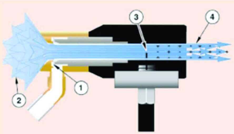 La Pistola de Aire Ionizado Gen4 incorpora un Jet de Aire de Alta Velocidad y un punto emisor energizado eléctricamente. Una pequeña cantidad de aire comprimido se inyecta en el Jet de aire (1), induciendo un flujo de gran volumen de aire circundante (2) a pasar a través de él. El punto emisor (sin descarga) en el extremo de salida de la pistola (3) ioniza toda la corriente de aire. El resultado es un flujo de aire ionizado de gran volumen (4), capaz de neutralizar cargas estáticas elevadas en fracciones de segundo. Un filtro regulador opcional limpia el aire comprimido y permiten un ajuste infinito del flujo de aire y la velocidad.